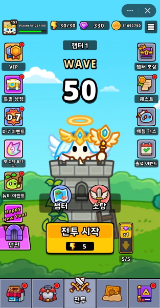 레벨업을 하면 공격력이 5, 성벽 체력이 100 올라가요.