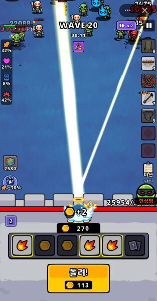 게임 플레이를 시작하면 오른쪽에는 스킬이 나와요. 스킬은 스킬 룰렛이 뜨면 선택할 수 있어요.