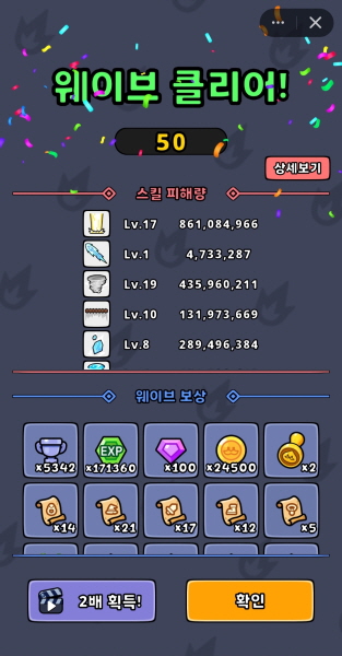 여기에서 '2배 획득'을 터치하면 광고가 나와요. 이건 꼭 해주는 것이 좋아요. 경험치 및 각종 아이템을 2배로 주거든요. 광고를 보는지의 여부가 게임 전체 난이도를 크게 좌우해요.