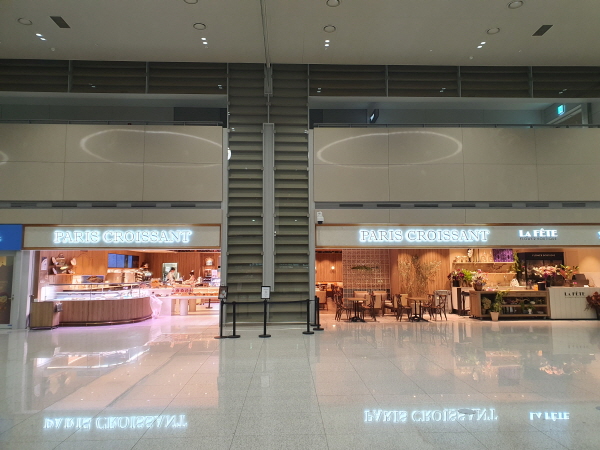제가 인천국제공항 제2여객터미널 24시간 카페 파리크라상 랜드사이드T2점에 갔을 때는 매우 늦은 시각이었기 때문에 여기 뿐만 아니라 공항 자체에 사람들이 거의 없었어요.