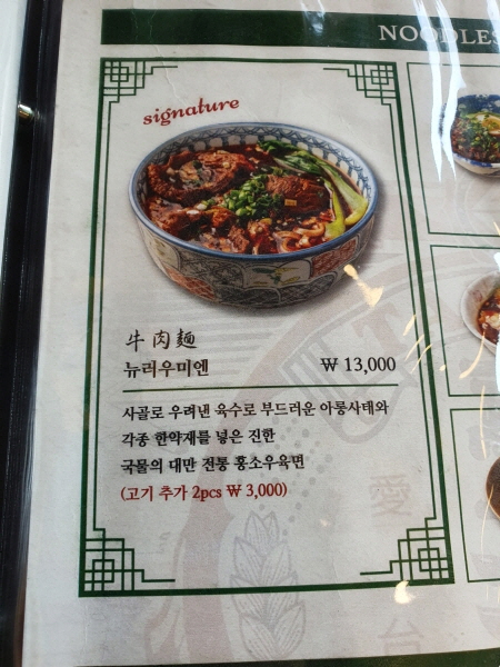 메뉴판에 나와 있는 뉴러우미엔 소개문은 '사골로 우려낸 육수로 부드러운 아롱사태와 각종 한약재를 넣은 진한 국물의 대만 전통 홍소우육면'이었어요.