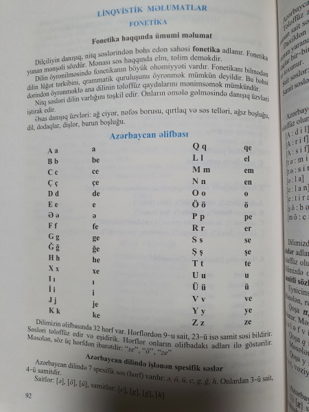 속표지에는 하늘색 글자로 AZƏRBAYCAN DİLİ 라고 적혀 있어요. 이것은 '아제르바이잔어'라는 의미에요.