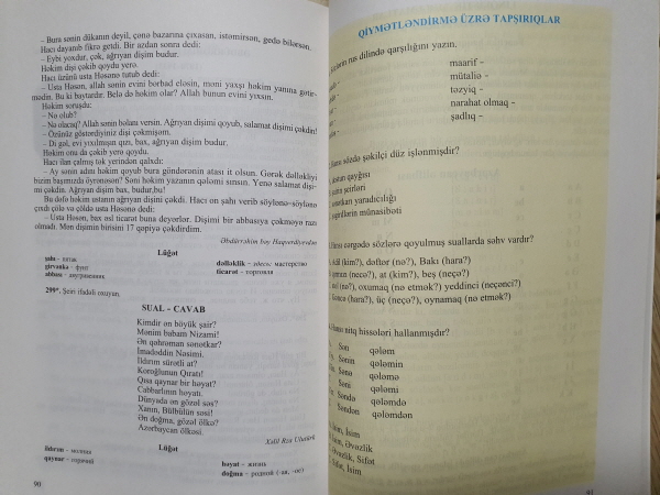아제르바이잔 러시아인 학교 10학년 아제르바이잔어 과목 교과서에서 새로 등장하는 문법은 아예 없었어요. 책에서 주요 주제는 아제르바이잔의 여러 문학 장르의 역사 소개였어요. 이러면 어려운 것들이 등장할 만도 한데 없었어요.