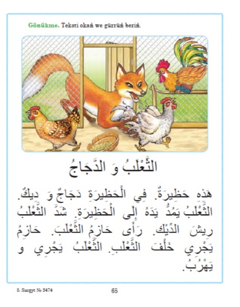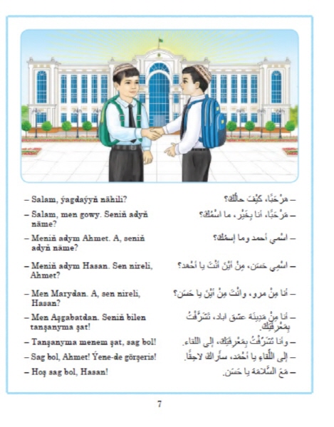 투르크메니스탄 중학교 1학년 - 5학년 아랍어 교과서는 처음에 이렇게 인사로 시작해요. 매우 평화롭고 정상적인 시작이에요.