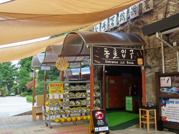 천곡동굴 안에 들어갈 때는 안전모를 쓰고 들어가야 했어요. 천장이 낮아서 머리를 천장에 부딪혀서 다칠 수 있다고 했어요. 안전모는 머리를 보호하기 위해 쓰는 것이었기 때문에 모자 위에 안전모를 덮어써도 되었어요. 턱끈만 잘 조여서 안전모가 벗겨지지만 않게 하면 되었어요.
