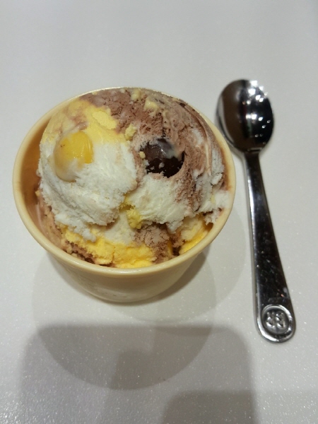 베스킨라빈스31 짱구가 좋아하는 외계인의 바나나킥 아이스크림은 세 가지 색깔 아이스크림으로 구성되어 있었어요. 하얀색 아이스크림, 초콜렛색 아이스크림, 노란색 아이스크림이었어요. 여기에 초콜렛색 프레첼볼과 노란색 프레첼볼이 박혀 있었어요.