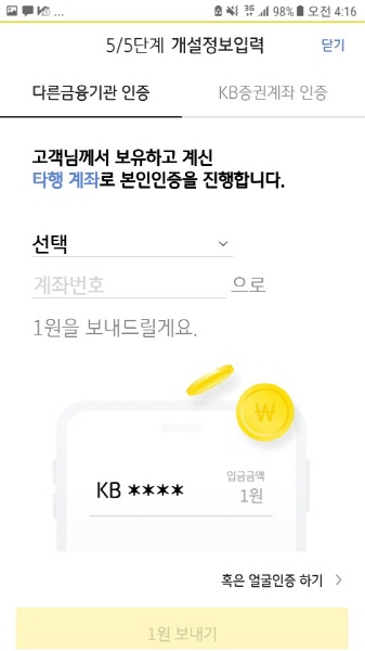본인 인증을 위해 계좌 인증을 해야 해요. 다른기관인증 방식과 KB증권계좌 인증 방식이 있어요. KB증권계좌가 있어도 다른기관인증 방식을 이용할 수 있어요. 타행계좌 인증 방식을 사용하면 1원이 입금되고 번호가 나와요. 그 번호를 입력하고 확인하면 되요.