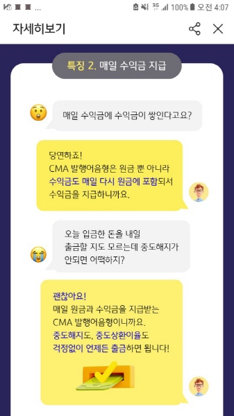 이도 저도 싫다면 발행어음형 CMA 계좌에 여윳돈, 비상금 입금하고 이자만 받아서 인출하는 방법도 있구요. 하루만 놔둬도 바로 이자를 받을 수 있기 때문에 초단기간 예치용으로 사용해도 괜찮아요.