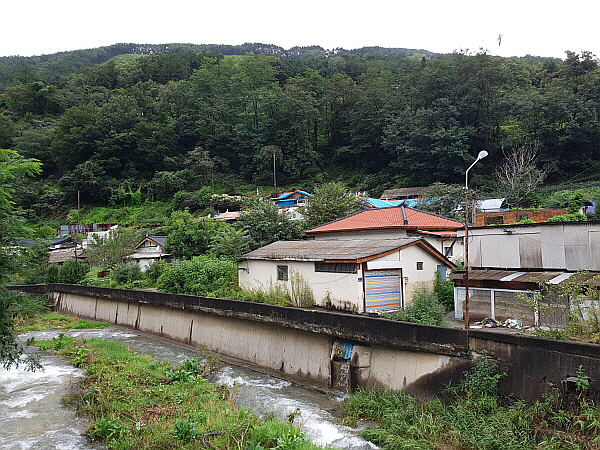입간판에는 마을 약도가 붙어 있었어요. 마을 약도 위를 투명한 아크릴판이 덮고 있었어요. 대체 얼마나 비가 많이 오고 습해졌는지 마을 약도를 덮은 아크릴판에 습기가 차서 약도가 제대로 보이지 않았어요. 약도를 보며 어떻게 돌아다녀야 하는지 보고 싶었지만 도저히 볼 방법이 없었어요. 뿌옇게 습기가 차서 잘 안 보이는 지도를 잘 봤어요. 옛우물터까지 걸어가면 이 동네를 대충 다 볼 수 있었어요. 옛우물터까지 갔다가 차를 세워놓은 곳으로 돌아와서 조동철교를 보러 가기로 했어요.