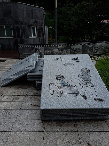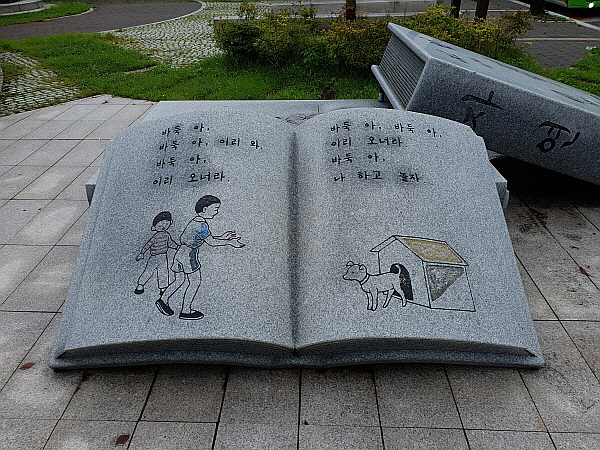 마을 안쪽으로 진입하는 곳에는 국어책과 자연책 조각이 있었어요. 자연책은 덮혀 있었어요. 국어책은 바둑이 동시가 새겨져 있었어요.