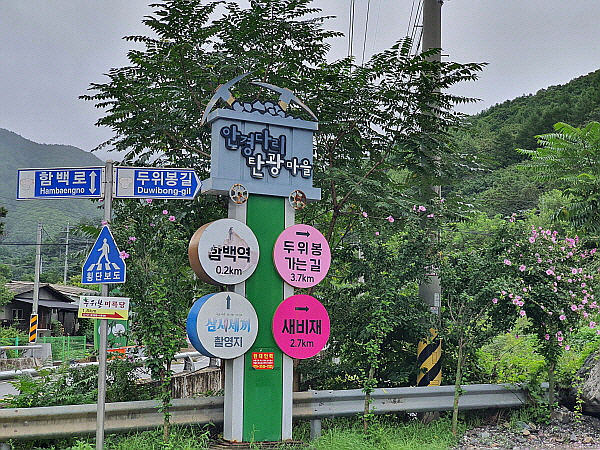 입간판이 하나 또 나왔어요. 여기가 안경다리 탄광마을이라고 알려주는 입간판이었어요. 근처에는 함백역, 두위봉, 새비재, 삼시세끼 촬영지가 있다고 나와 있었어요.
