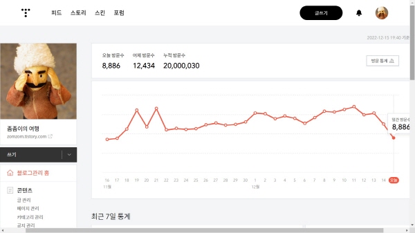 2022년 12월 15일 저녁 7시 43분. 좀좀이의 여행 티스토리 블로그 누적 방문자수가 드디어 2천만명을 넘었어요. 누적 방문수는 20,000,030명이었어요.