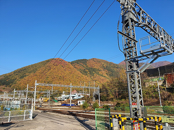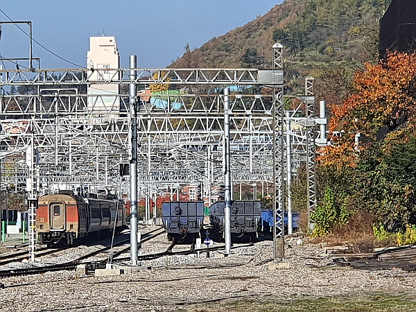 멀리 도계역 방향으로 탄차와 무궁화호 열차가 보였어요.