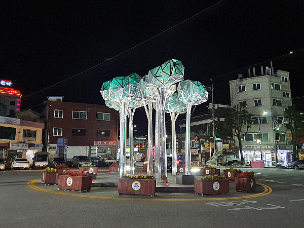 도계광교에 있는 장식은 예뻤어요. 이렇게 보면 도계역 광장 앞 조형물이 곰팡이가 아니라 나무 같이 보이기도 했어요. 물론 초록불이 들어왔기 때문에 그랬어요. 낮에 보면 시커먼 대가리에 기둥 있는 영락없는 검은 곰팡이 모양이에요.