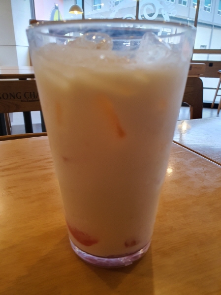공차 더블 피치 밀크티는 아래에 빨간 복숭아 젤리가 깔려 있었어요. 타피오카 펄 대신 복숭아 젤리가 들어가 있는 음료였어요.