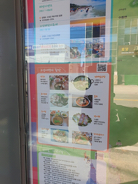 버스정류장 벽에 있는 강원도 고성군 관광 안내 중 고성군 음식 소개가 있었어요. 강원도 고성군 별미로는 막국수, 문어숙회, 추어탕, 도루묵찌개, 명태맑은탕, 물회, 도치두루치기와 더불어 방어회가 있었어요. 방어회 옆에는 '고성은 새롭게 떠오르는 방어 주산지!'라고 소개되어 있었어요.
