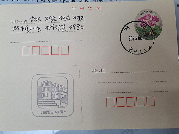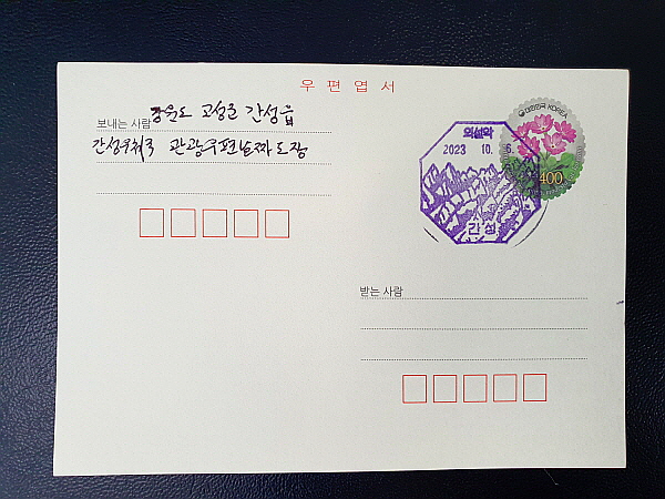 준비해간 우편엽서에 간성우체국 관광우편날짜도장 스탬프를 찍었어요.