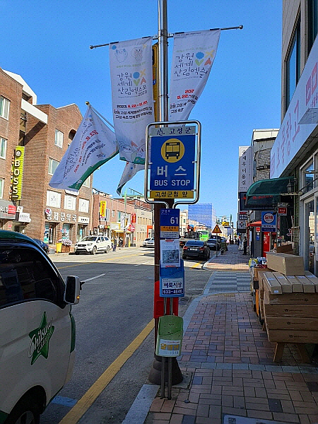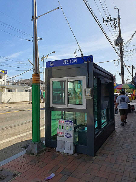 거진우체국에서 나왔어요. 버스정류장으로 갔어요.