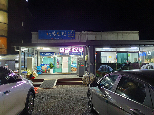 행복식당으로 갔어요. 행복식당은 영해터미널 큰 길 건넌 바로 맞은편에 있었어요. 행복식당은 무려 밤 9시까지 영업하는 식당이었어요. 시골 지역은 식당들이 일찍 문을 닫아요. 게다가 제가 갔을 때는 12월 초 비수기였어요. 그래서 밤 9시까지 영업하는 식당은 매우 드물었어요.