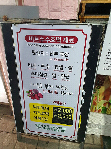 사장님께서 호떡을 만드는 동안 호떡가게를 밖에서 구경했어요. 호떡잡에서 판매하는 호떡은 비트수수호떡이었어요. 원산지는 전부 국산이라고 적혀 있었어요. 호떡에 들어가는 재료는 비트, 수수, 찹쌀, 쌀, 흑미찹쌀, 밀, 연근이라고 나와 있었어요.