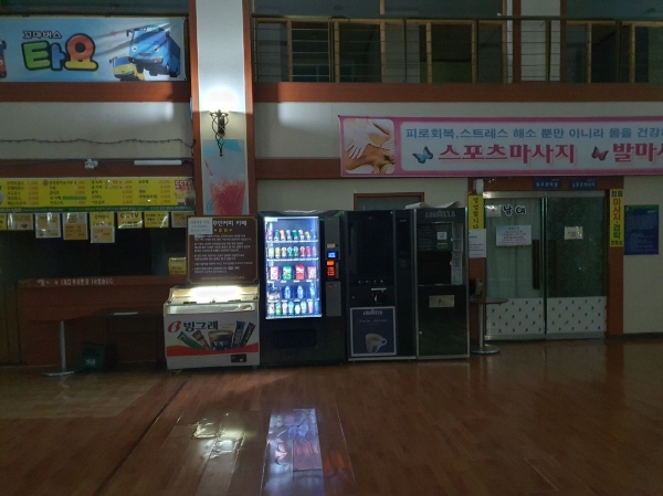 찜질방 구내 식당은 식당이라기 보다는 조그마한 가게에 가까웠어요. 음료와 컵라면을 판매하고 있었어요.