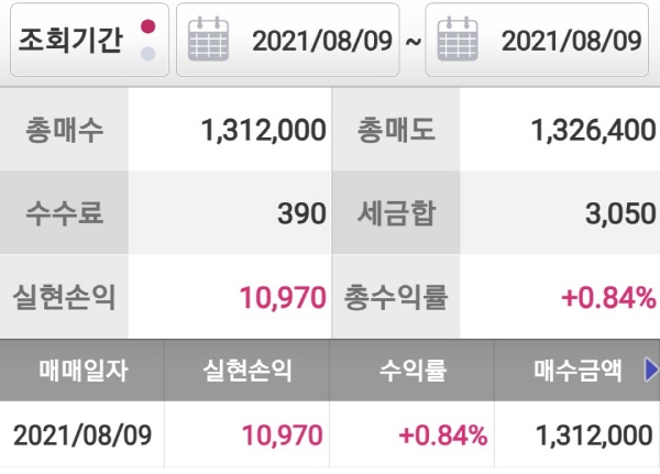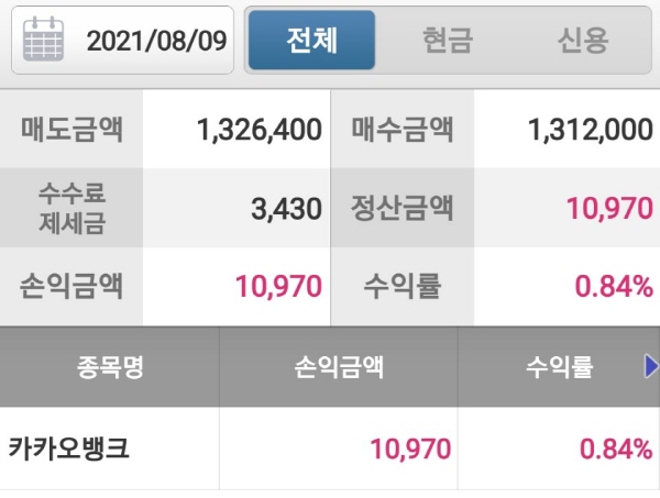 2021년 8월 9일, 카카오뱅크 주식을 82000원에 16주 매수했어요. 매수금액은 1,312,000원이었어요. 이후 전량 82900원에 매도했어요. 매도금액은 1,326,400원이었어요. 수수료와 세금으로 3430원 뜯겨서 최종적으로 획득한 돈은 10,970원이었어요.