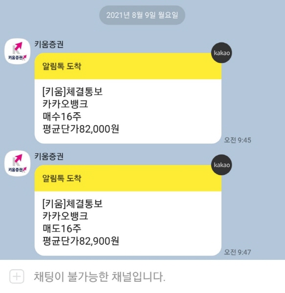 2021년 8월 9일 아침 9시 47분, 코스피 323410 카카오뱅크 주식 보유 수량 전량인 16주를 82900원에 모두 매도했어요.