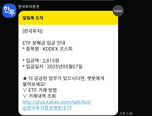 "한국투자증권에서 뭐 왔지?" 집에서 할 것 하고 있는데 한국투자증권에서 카카오톡으로 메세지가 왔어요. 한국투자증권에서 카카오톡으로 메세지가 오는 일은 주로 ETF 분배금과 관련 있는 메세지였어요. '미국 것 뭐 들어왔나?' 작년에 한국투자증권에서 이벤트를 할 때 받은 돈으로 미국 채권 ETF를 사놓은 것이 있었어요. 그래서 그 미국 채권 ETF 분배금이 들어온 줄 알았어요. 일단 돈이 들어왔다는 소식일 확률이 높았기 때문에 하던 것을 잠시 멈추고 한국투자증권이 보내온 메세지를 확인해봤어요. 한국투자증권이 카카오톡으로 보낸 메세지는 PC에서는 확인할 수 없고 스마트폰으로 봐야 했어요. 스마트폰 잠금 화면을 풀고 한국투자증권에서 카카오톡으로 보내온 메세지를 확인해봤어요. "돈 들어왔네?" 한국투자증권이 제..