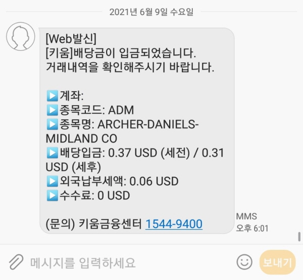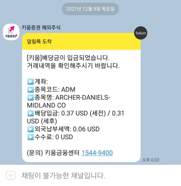 2021년 12월 9일 목요일 오후 6시였어요. 키움증권에서 카카오톡 메세지가 왔어요. "배당 들어왔나보네." 키움증권에서 제게 카카오톡 메세지 보내올 일이라고는 미국 주식 배당금 들어왔다는 것 외에는 없어요. 키움증권은 미국 주식 투자 전용 계좌로 사용하고 있거든요. 딱히 매수하거나 매도한 것이 없으니 카카오톡 메세지는 보지 않아도 미국 주식 배당금이 입금되었다는 내용일 거였어요. 카카오톡을 확인해봤어요. "ADM 배당금 들어왔네." 키움증권이 보내온 메세지 내용은 미국 지구온난화 이상기후 전세계 식량난 관련주 ADM - 아처 대니얼스 미들랜드 주식의 2021년 12월 배당금이 입금되었다는 내용이었어요. 미국 지구온난화 이상기후 전세계 식량난 관련주 ADM - 아처 대니얼스 미들랜드 주식의 2021년 ..